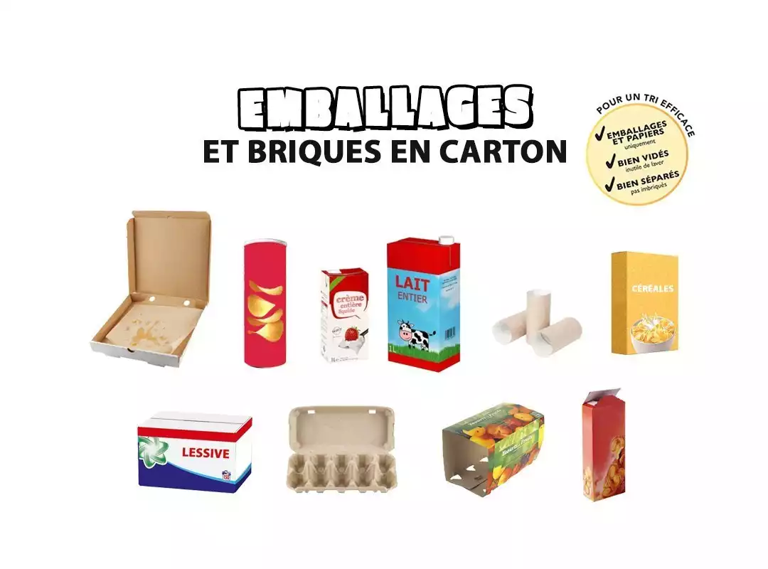 Les petits colis, les barils de lessive, les boîtes à œufs, les cartons de pizza, les cartonnettes (sur-emballages de pots de yaourts, de gâteaux, de piles, etc.), tous les petits emballages en carton tels que les boîtes de céréales et les tubes de chips ainsi que les briques alimentaires.
